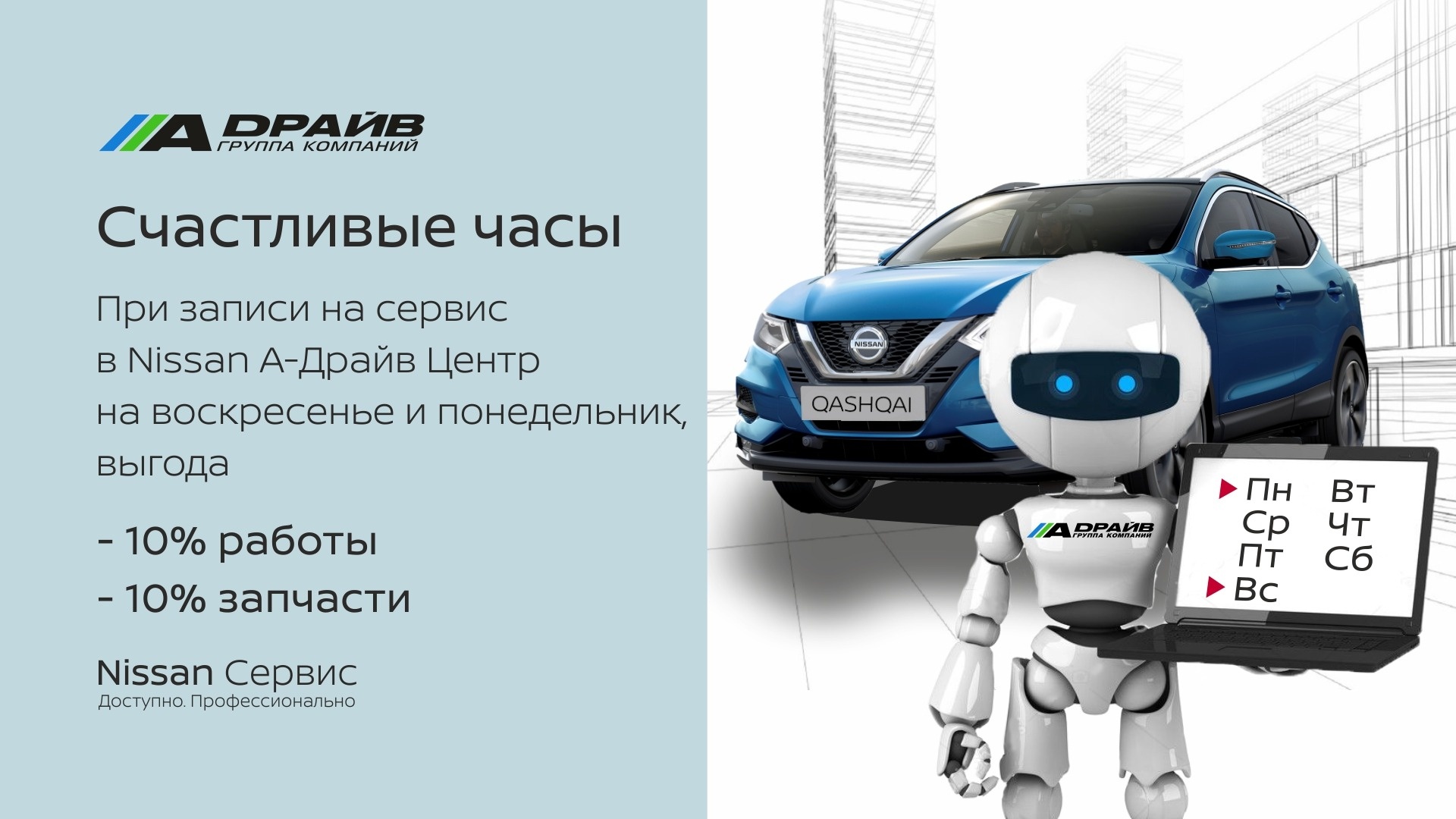 Сервисный центр ООО «А-Драйв Центр», входящий в ГК «А-Драйв», предлагает вам воспользоваться дополнительной скидкой при записи на сервис Nissan.